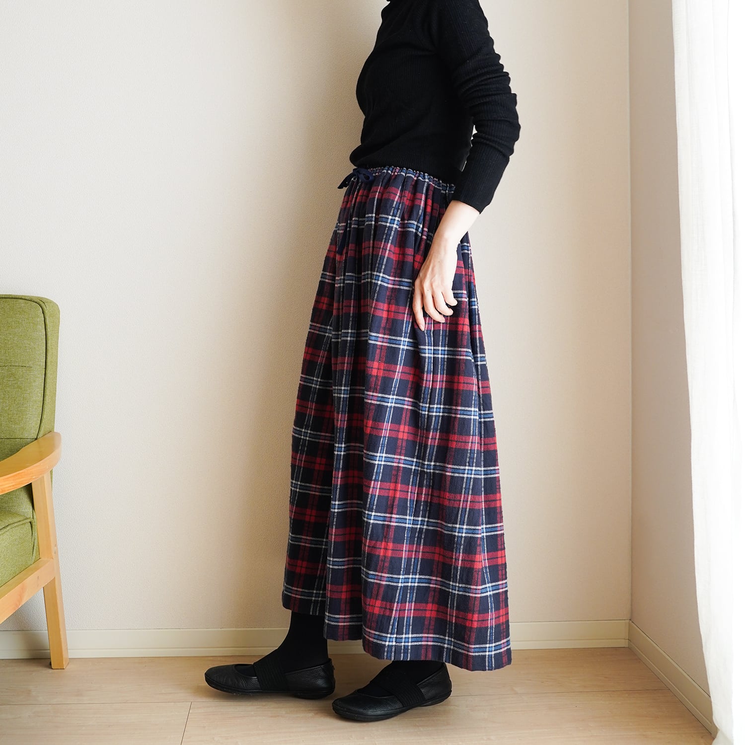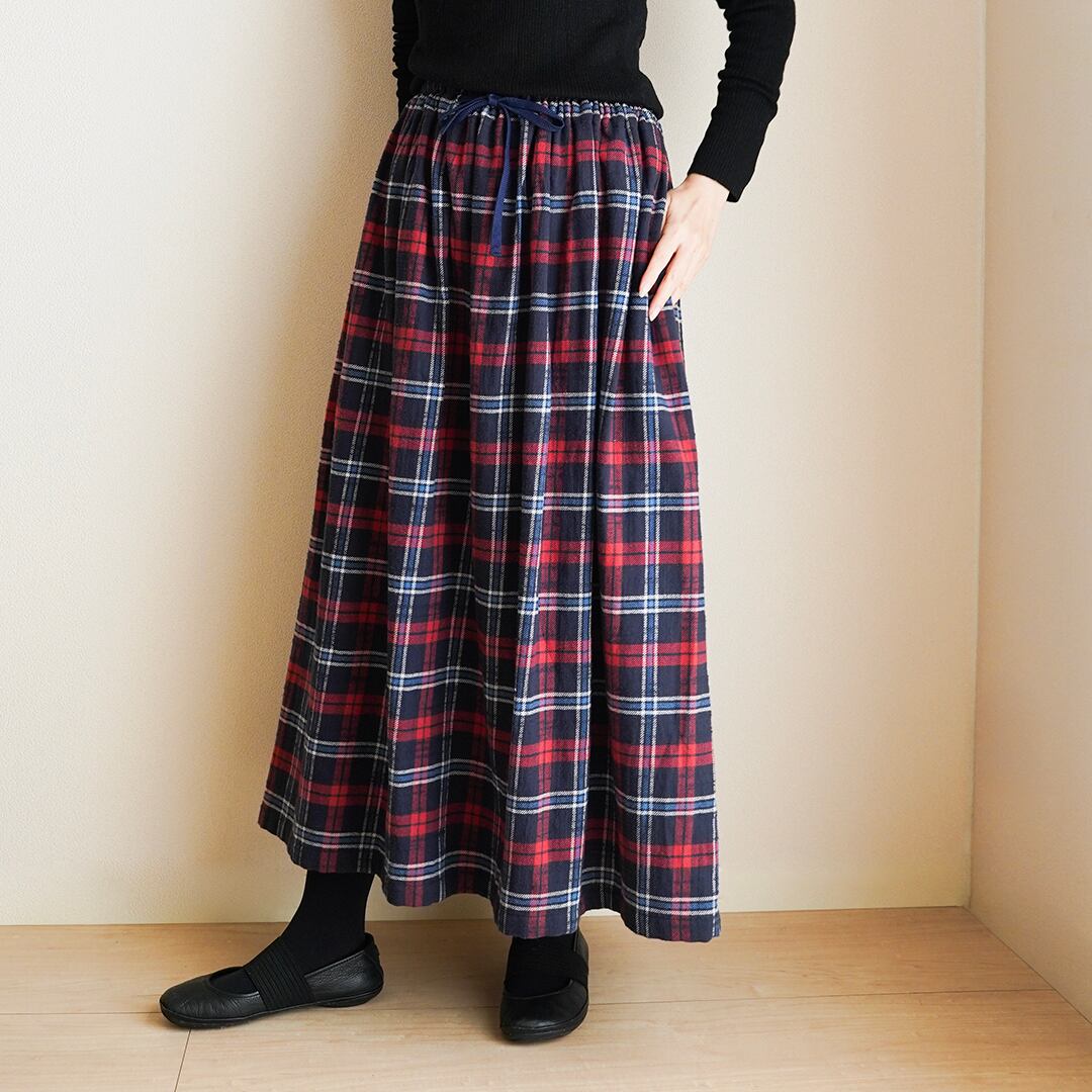 ネル素材のタータンチェック ギャザーロングスカート 総丈90cm